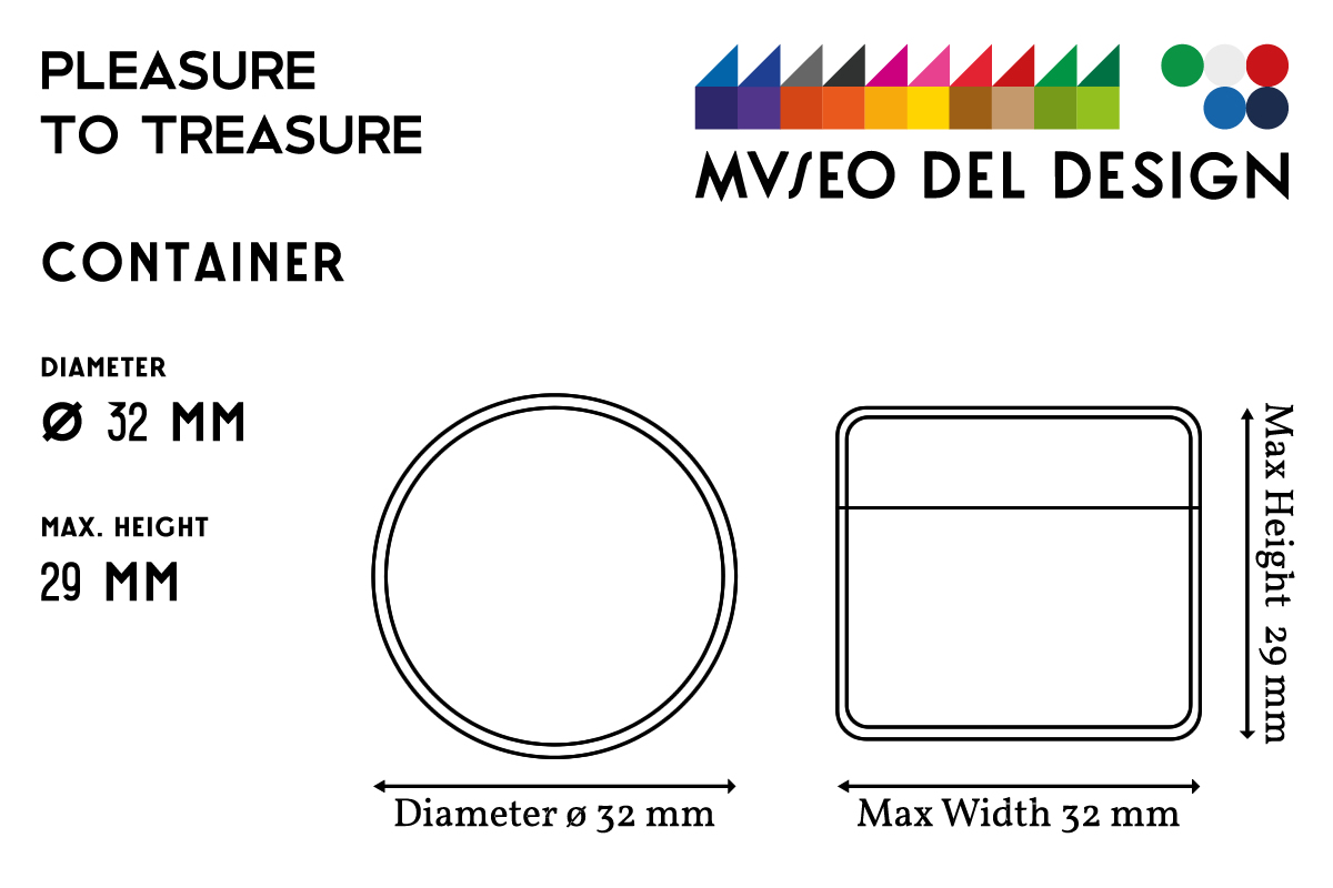 Notes: Technical Details, Notes and Disclaimers: Tax Deductible. Pleasure to Treasure Display Container inner dimensions are as follows: 29 mm height (h), 32 mm Diameter (D). Container contents are subject to approval of museum curator. Container contents should not include any organic material, you are also not allowed to deposit drugs, radioactive materials, poisonous chemicals and other illegal, biohazardous and otherwise dangerous substances. Please kindly note that the museum curator, at their sole discretion, may decide to refuse your participation.