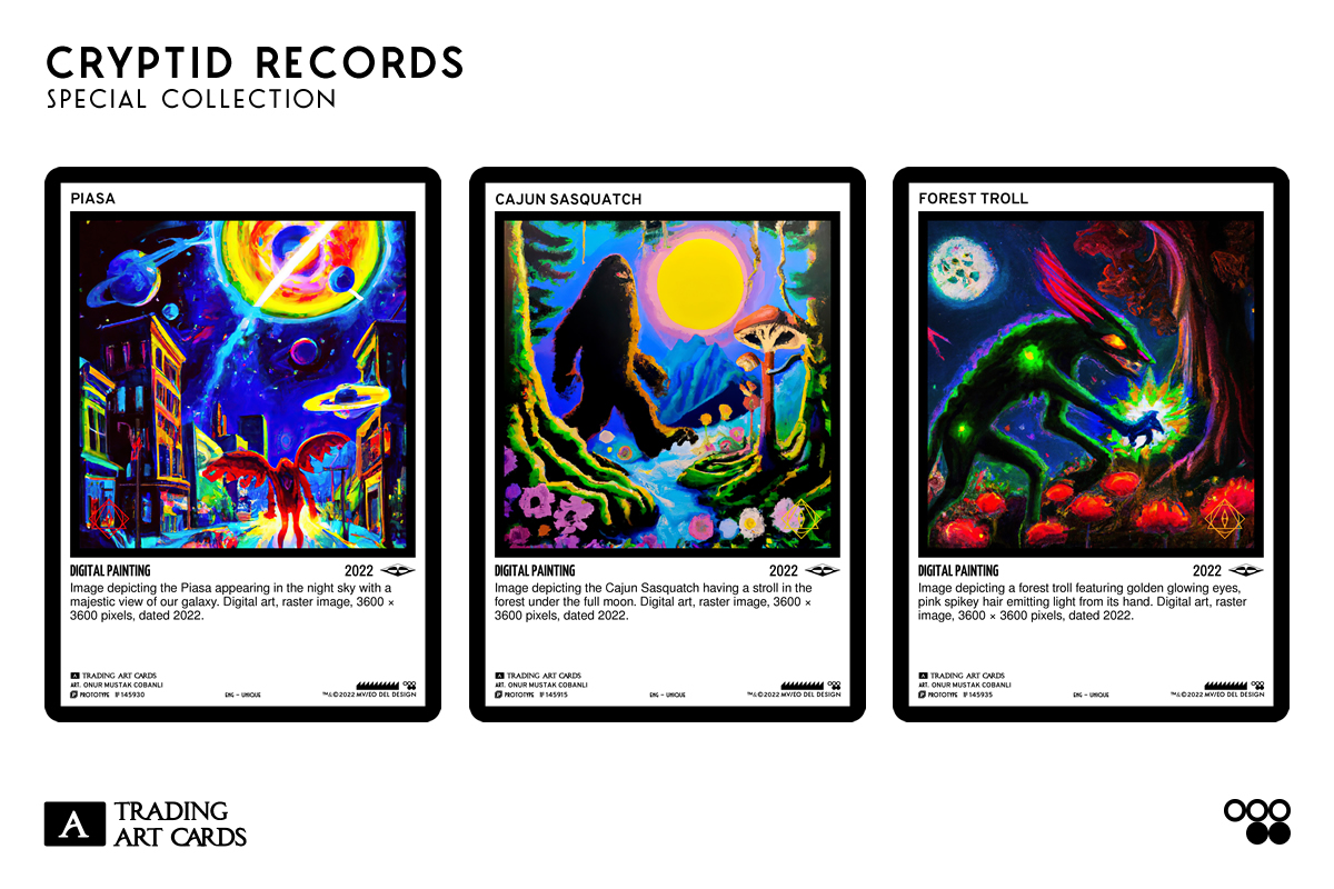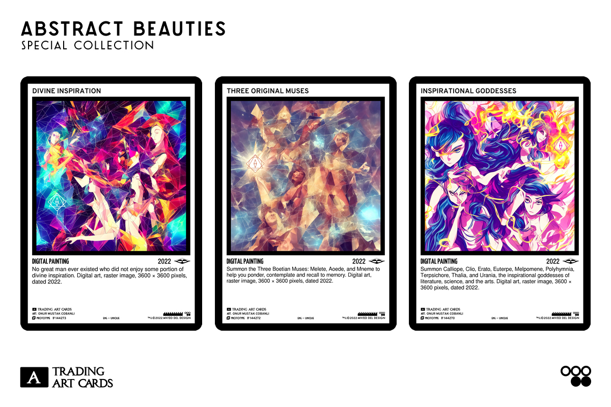 Trading Art Cards will follow the following fundamental design principles: 1. Trading Art Cards must have really cool names that evoke and conjure strong emotions. 2. Trading Art Cards should have the greatest aesthetics, the most amazing artwork, the best designs. 3. Trading Art Cards should make complete sense; any minigame cards should have their action and value be guessable easily. 4. Trading Art Cards must resonate with minds, emotions and psyche of people, and aim to be well-known, preferred, quality invoking, coveted, exclusive artifacts of desire. 5. Trading Art Cards must feature unique and well-though details that people are fond of, that people could bond with, that people will love about. 6. Trading Art Cards are designed to be loved, not to be liked. 7. Trading Art Cards will feature a wide variety of subjects and designs that are aimed to reach hearts of people with exquisite tastes. 8. Trading Art Cards will have great randomness and variance in order to create an amazing unboxing experience and a thriving secondary market, a desire to exchange, sell and purchase, to collect and to talk about.