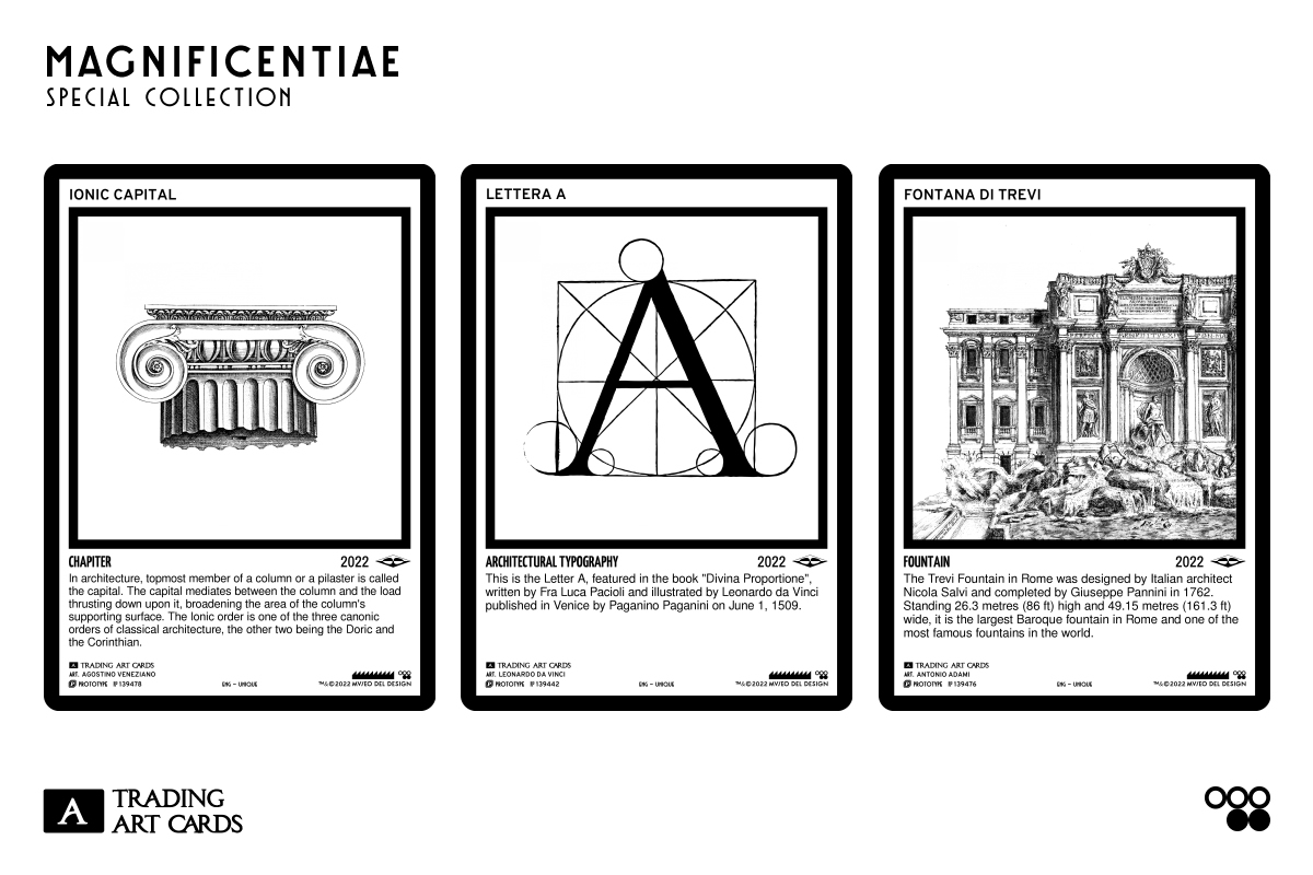 Maximized for collectability, designed to be auctionable memorabilia that appreciates in value. Museo del Design Trading Art Cards are designed to be highly collectible with a heavy focus on active support of the secondary market by means of a very large variation of card artworks that increases collection sizes, strategically planned rarity tiers and limited print runs that introduce artificial scarcity leading to increase in card value, high technology print and manufacturing that incorporates usage of impression worthy printing medium featuring acid-free base with elegant surfaces that deliver high D-max and wide colour gamut, usage of ink, technology and materials that lead to best colour accuracy high-fidelity reproduction combined with artisan craftsmanship and great attention to details, cantered cutting, edge trimming and packaging as well as incorporation of excellent, aesthetically pleasing and desirable artwork to increase intrinsic individual card value.